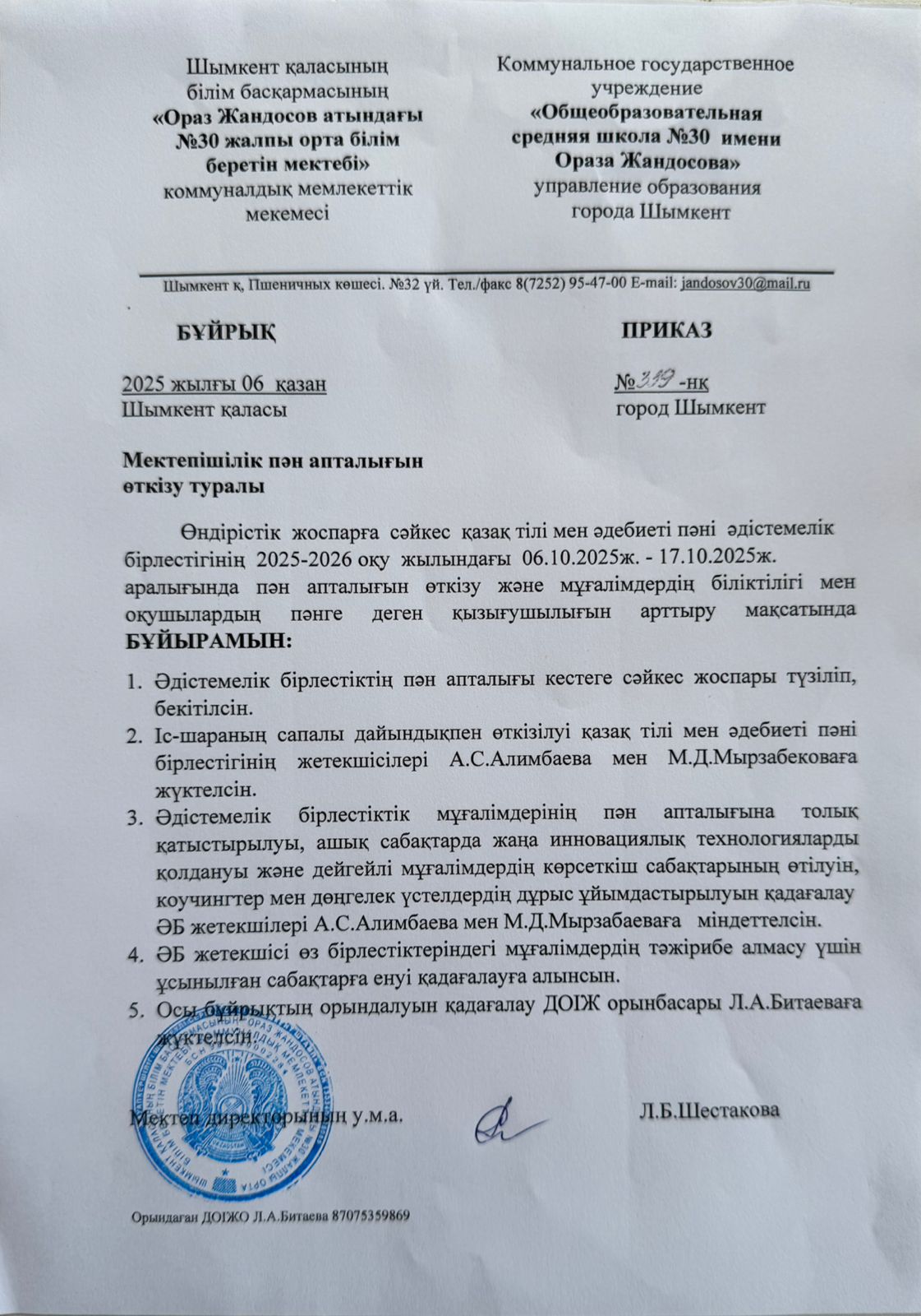 Ораз Жандосов атындағы №30 жалпы орта білім беретін мектепте 08 желтоқсан күні «Мәңгілік ел – мәртебелі тіл» тақырыбында қазақ тілі мен әдебиеті апталығының ашылу салтанаты өтті. Апталықтың ашылуында шашу шашылып, мектеп оқушылары ән айтты