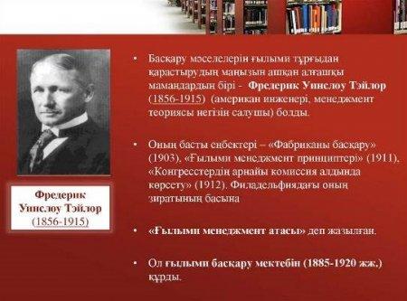 Дәл сол «менеджмент» ұғымының негізін салушыларының бірі Ф.У.Тейлордың «Ғылыми менеджменттің принциптері мен тәсілдері» деген басты еңбегімен танысып, өзіме қажетті көп ақпарат алдым. Тейлор басқару менеджментінің төрт қағидасы ретінде мыналарды қарастырады. Біріншіден, практикада қалыптасқан ескі, дәстүрлі жұмыс тәсілдерінің орнына ғылыми іргетасты құру, оның әрбір элементін ғылыми тұрғыдан зерттеу. Ол «басқаруда да, көпір салуда да асқан дәлдік керек»,- дейді. Кез келген істі бастағанда, ғылымға сүйене отырып, ғылыми зерттеуден өткізіп қарастыруды айтады. Екіншіден, жұмысшыларды ғылыми критерийлері бойынша таңдап, оларды кәсіпке бейімдеу, жұмысшылар арасында жағымды психологиялық орта мен кәсіби қарым-қатынас мәдениетін орнатуға баулу. Үшіншіден, еңбекті ұйымдастырудың ғылыми ойластырылған жүйесін практикаға енгізу ісінде әкімшілік пен жұмысшылар арасындағы ынтымақтастық орнату. Төртіншіден, еңбек етуде әкімшілік пен жұмысшылар арасындағы жауапкершілік.