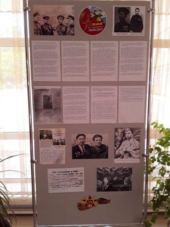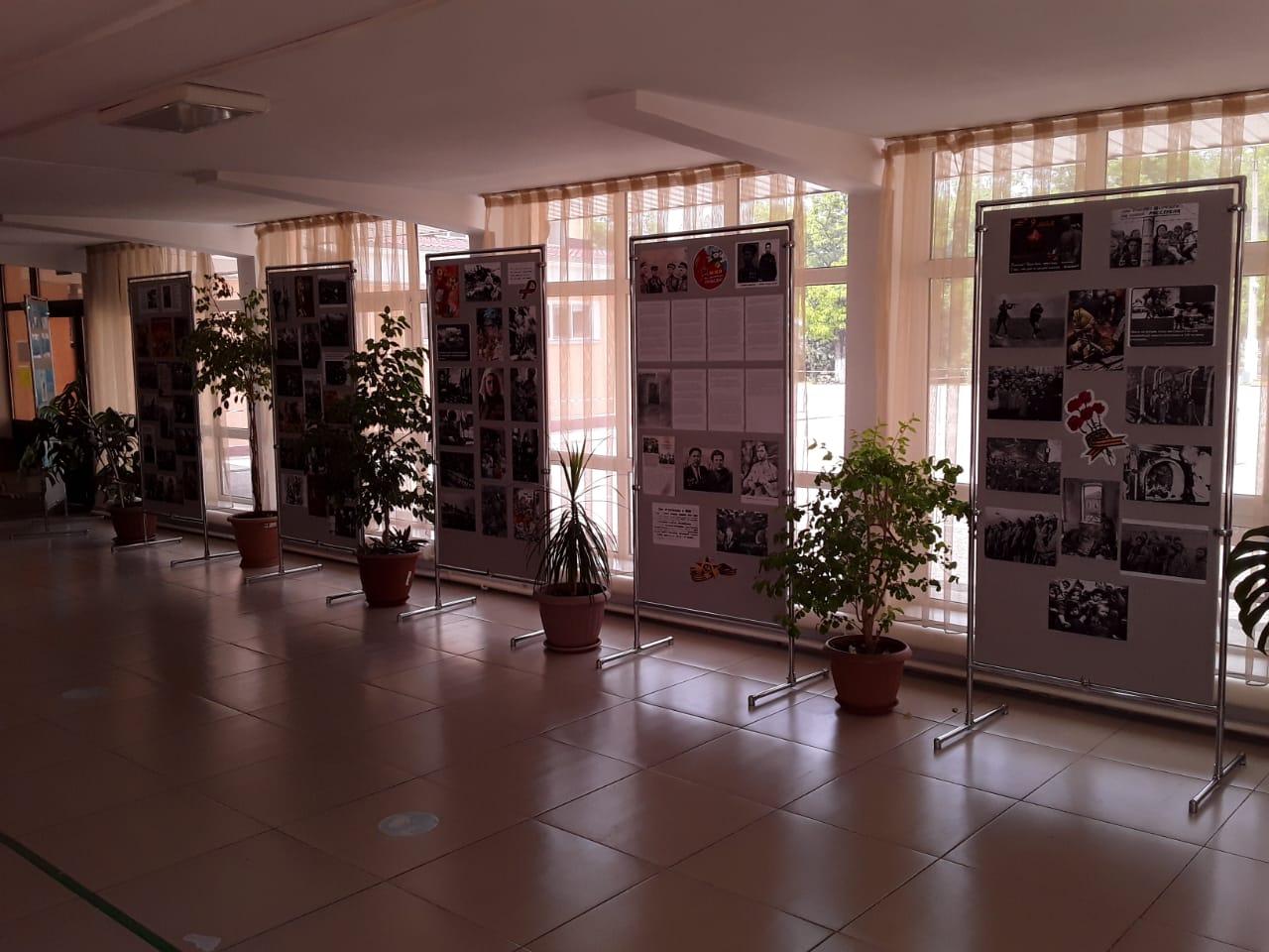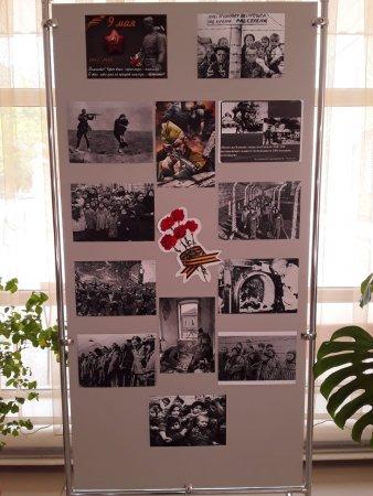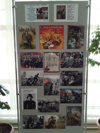 В вестибюле школы развёрнута выставка фотографий и рисунков о Великой Отечественной войне. Учитель технологии Бекмурзин Р.С. совместно с группой старшеклассников собрали документальный материал о подвиге советских солдат. Учителя начальных классов проведут знакомство с экспозицией выставки.