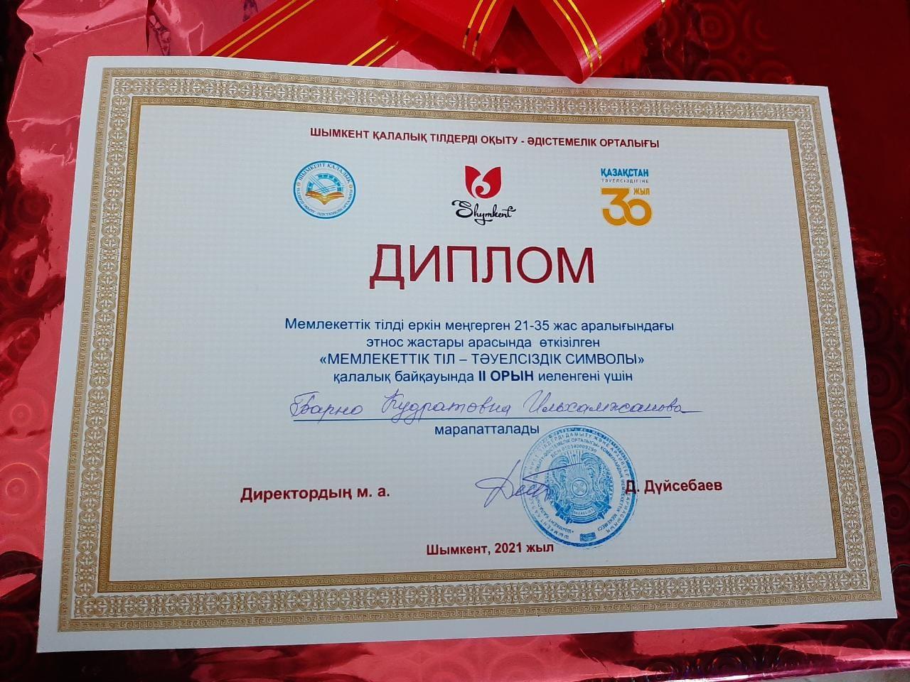 Молодой учитель школы Ильхамжанова Барно Кудратовна приняла участие в конкурсе #Государственный язык-символ Независимости# среди представителей разных этносов на знание и свободное владение государственным языком,организованной Городским учебно-методическим центром.Ильхамжанова Б.К.заняла почётное 2 место.Ее наставником в подготовке стала заместитель директора школы по учебной работе Досалиева П.А.Поздравляем!