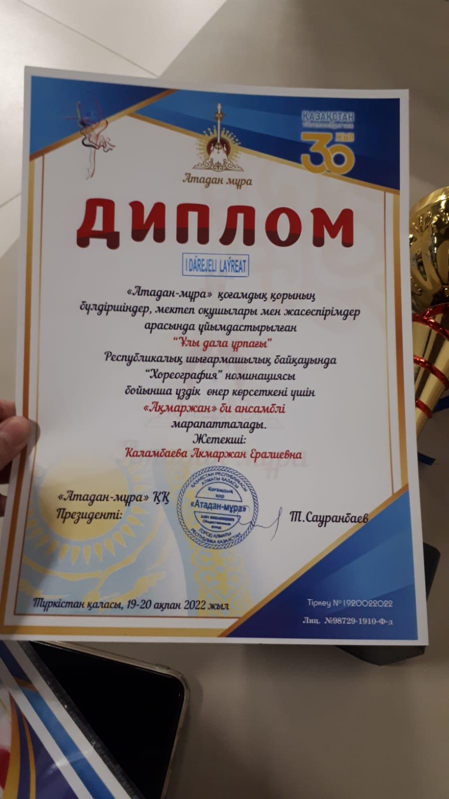 ТҮРКІСТАН ҚАЛАСЫНДА "АТАДАН -МҰРА" ҚОРЫ ҰЙЫМДАСТЫРҒАН РЕПУБЛИКАЛЫҚ "ҰЛЫ ДАЛА ҰРПАҒЫ" АТТЫ БАЙҚАУҒА ТӘЛІМГЕР ҚАЛАМБАЕВА АҚМАРЖАННЫҢ ЖЕТЕКШІЛІГІМЕН МЕКТЕБІМІЗДІҢ 9Е СЫНЫП ОҚУШЫЛАРЫ ҚАТЫСЫП 1 ОРЫНДЫ ИЕЛЕНДІ.
