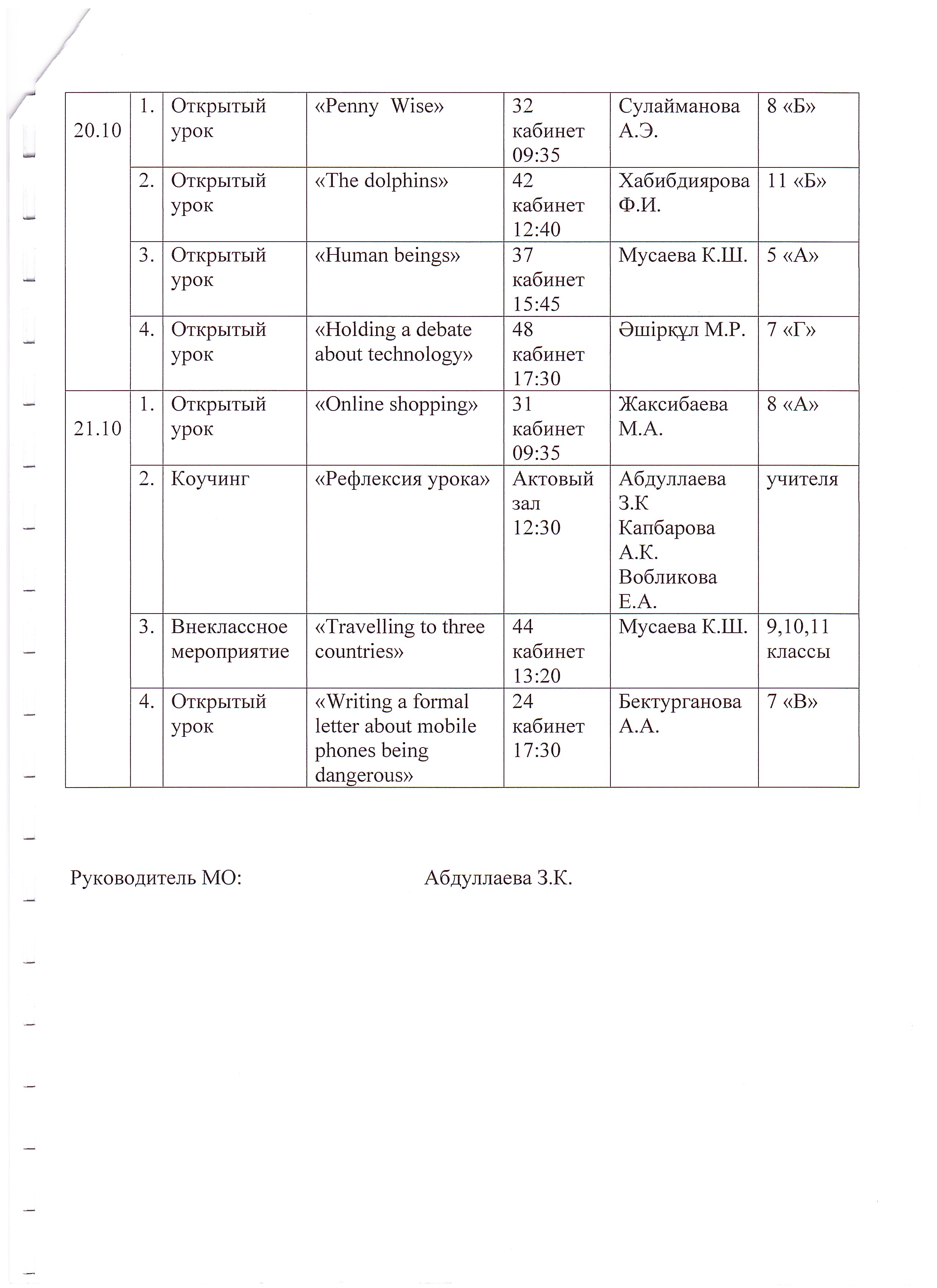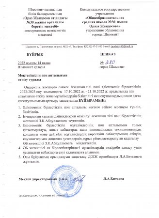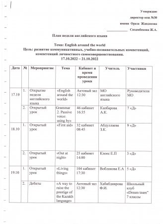 Шымкент қаласы білім басқармасына қарасты Ораз Жандосов атындағы №30 жалпы орта білім беретін мектебінде 17 қазан күні ағылшын тілі әдістемелік бірлестігінің «English around the world» тақырыбында 17.10. - 22.10.2022 жж. аралығында өтетін апталығының ашылуы болды.