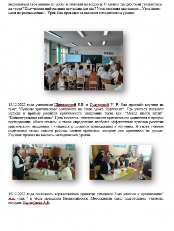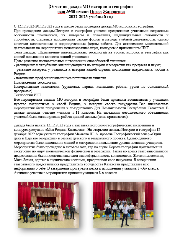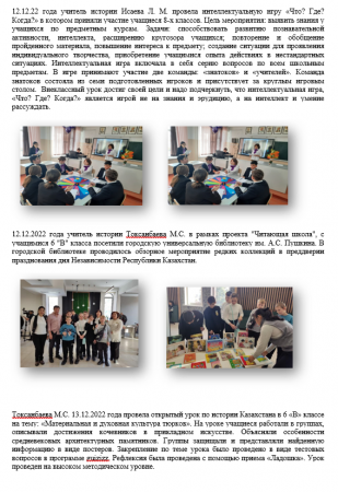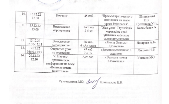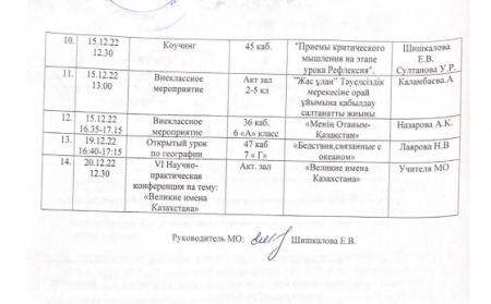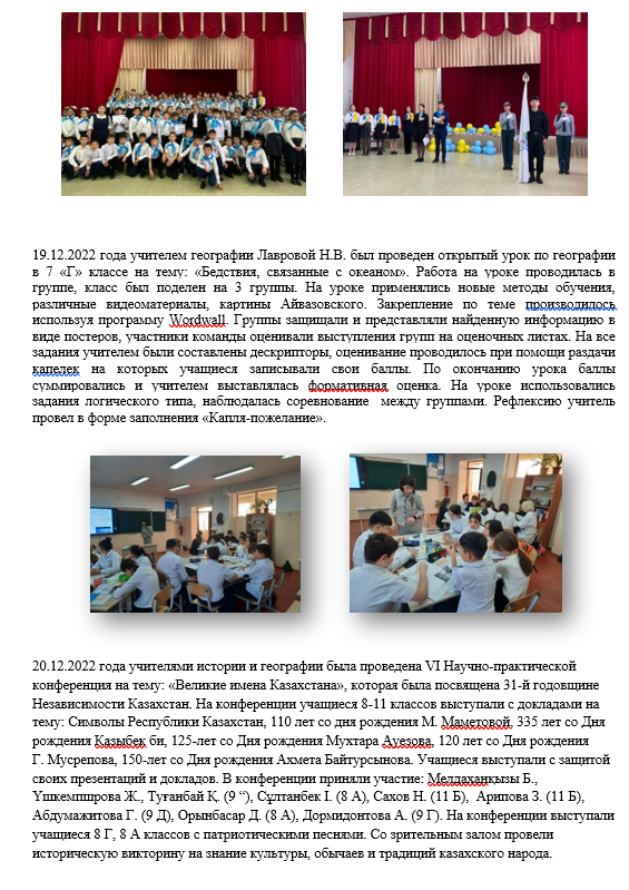 2022 жылдың желтоқсан айының 20-ы күні мектебімізде тарих және география пәндер бірлестігінің жабылуы Қазақстан Республикасының Тәуелсіздік күніне орай «Қазақстанның ұлы есімдері» тақырыбында VI мектепішілік конференциямен болып өтті.