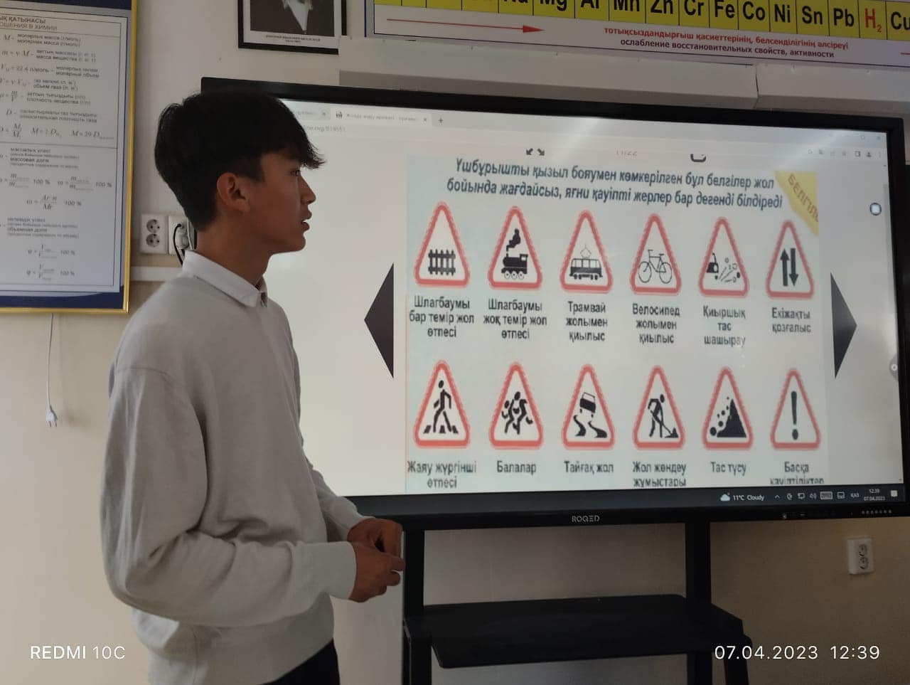 Оқушыларды жол белгілерімен, жолда жүру ережелерімен таныстырып, жол қауіпсіздігі сақталмаған жағдайда кездесетін жарақаттар немесе түрлі жағдайлар туралы әңгімелеп, оқушыларды көшеде дұрыс жүріп, жол ережелерін, қауіпсіздігін сақтау бойынша арнайы бейнероликтер көрсетіліп, оқушылар тарапынан туындаған сұрақтарға жауап беріп, пікір алмасты.