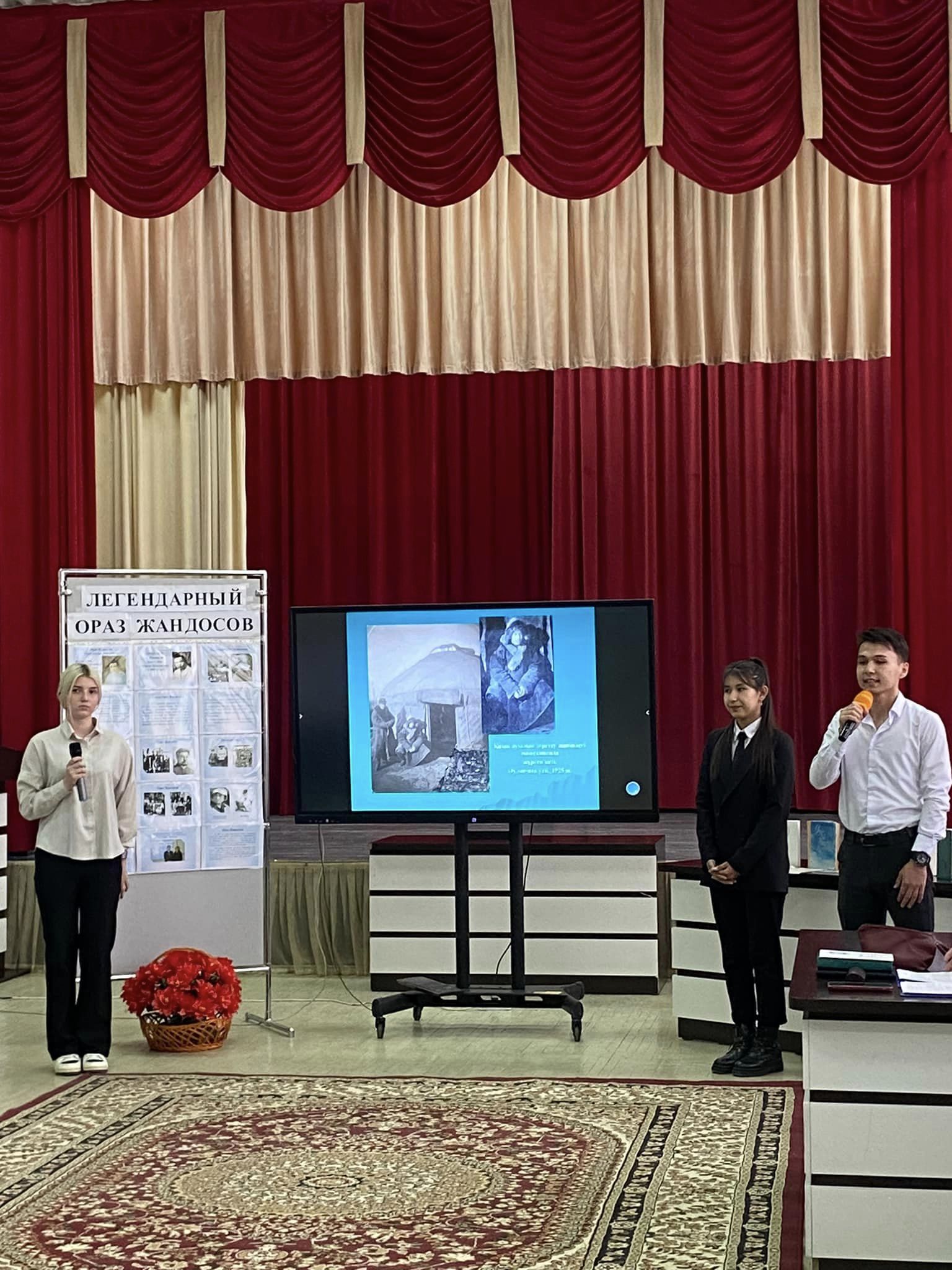 Ораз Кикимович Жандосов – казахский общественный и государственный деятель, член Коммунистической партии большевиков (ВКПб), репрессирован в 1937 году. Определением Военной коллегии Верховного Суда СССР от 8 июня 1957 года посмертно реабилитирован. Патриотическое воспитание подрастающего поколения является одной из важнейших задач современной школы. Целями и задачами проведения мероприятия стало патриотическое воспитание молодежи, знакомство подрастающего поколения с жизнью и деятельностью Ораза Жандосова.