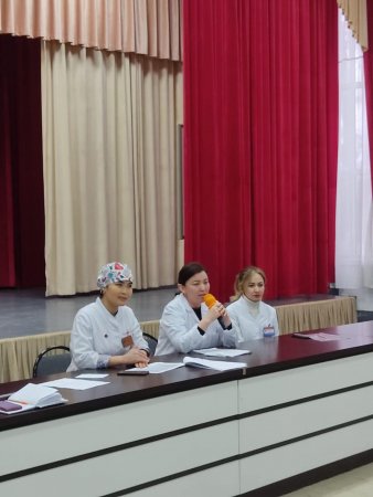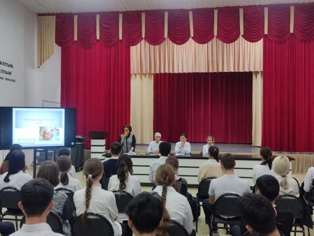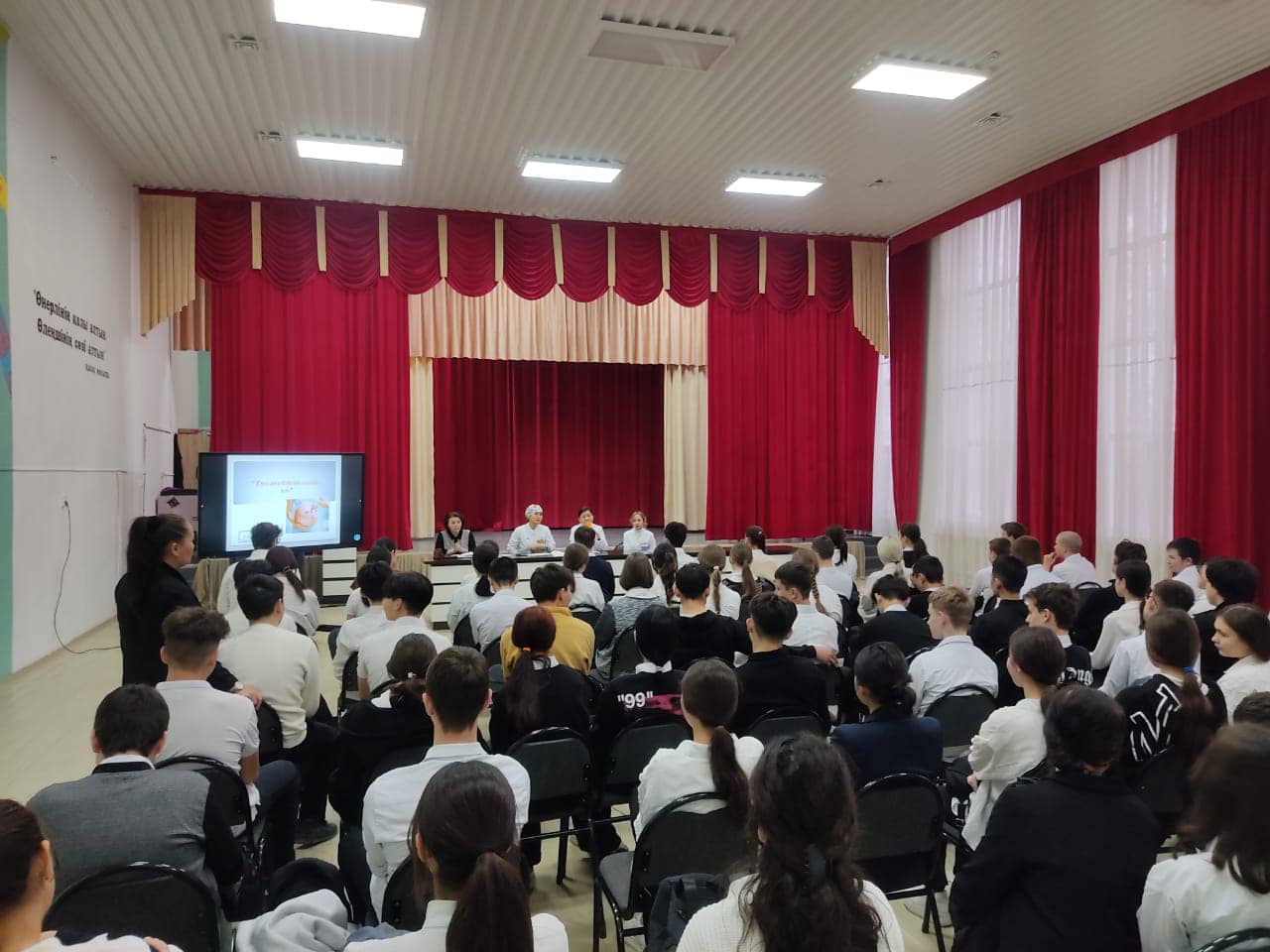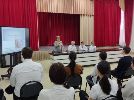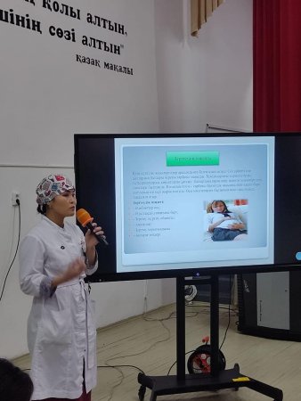 №5 емхананың гинеколог дәрігері Алтынай Ерғалиқызы сөз алып, «Ерте жүктіліктен қалай сақтануға болады? Ерте жүктілік немен қауіпті?» - деген сауалдар төңірегінде ой қозғап, 9-10 сынып қыздарымен пікір алмасты. Жасанды түсік — болашақта бала сүю мүмкіндігін төмендететіні, яғни бедеулікке апарып соқтыратыны, жасанды түсік жасататын қыздардың 30 пайызы онкологиялық , гинекологиялық ауруларға шалдығатыны туралы айтып өтті. Негізінен жоспарланбаған жүктіліктің 90% отбасындағы тәрбиеге және қарым-қатынасқа байланысты екендігі айтылды.