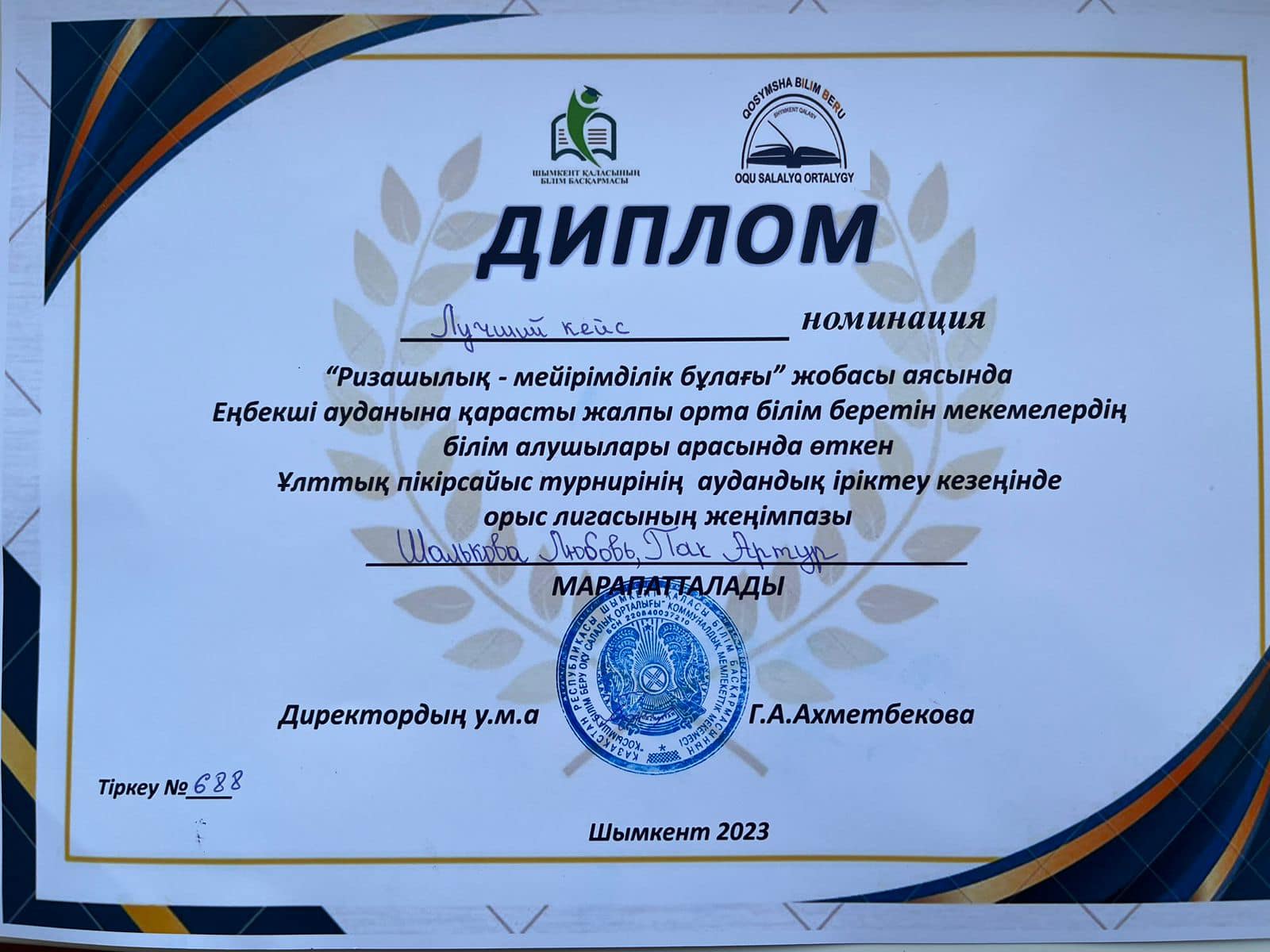 орыс лигасының жеңімпаздары 10-сынып оқушылары Шалькова Любава, Пак Артур “Үздік кейс” номинациясын алды.