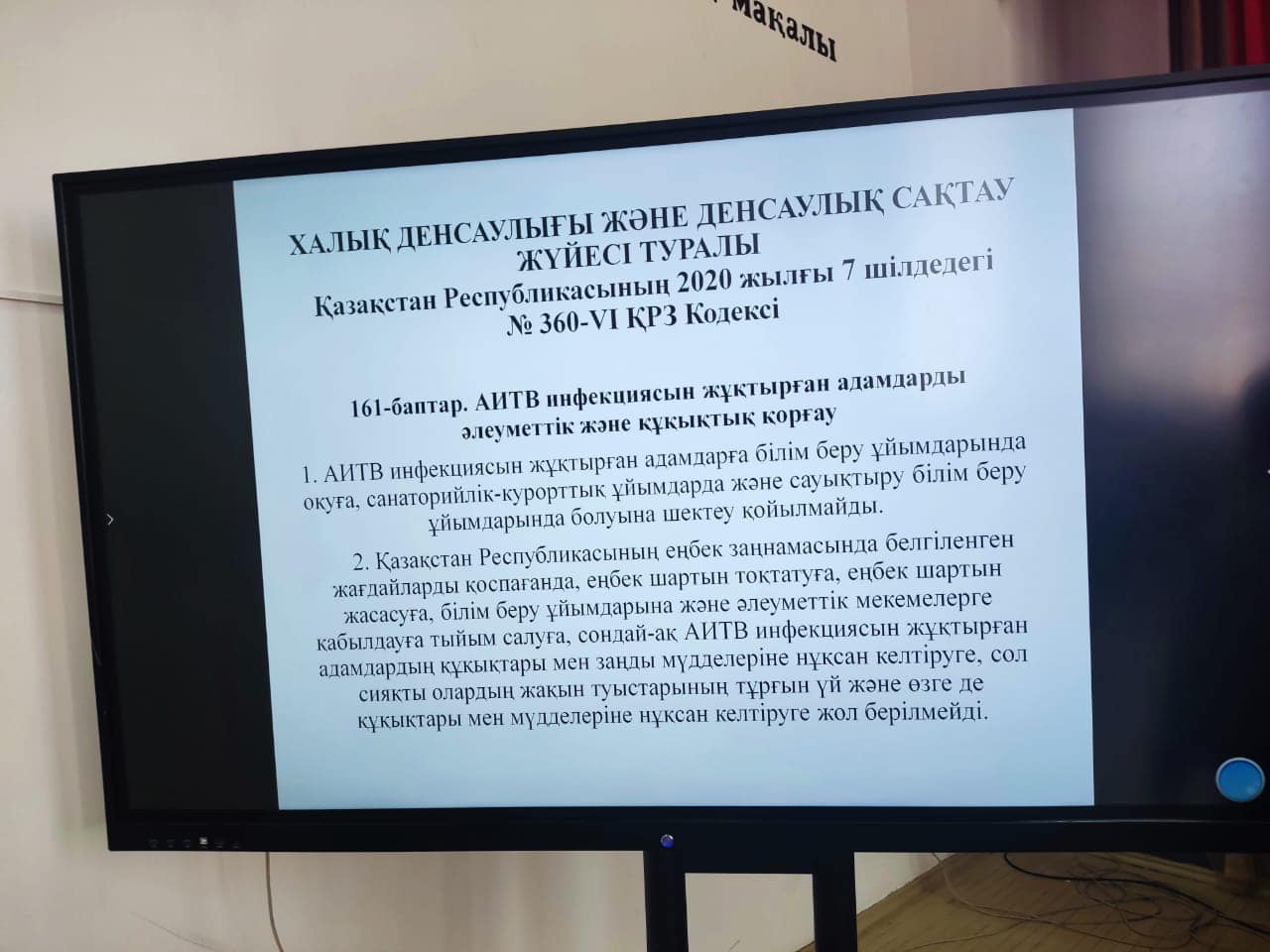 Кездесу барысында АИТВ-ның әлем және Қазақстан бойынша таралуы, АИТВ, ЖИТС туралы түсінік, АИТВ-ны алдын-алу жолдары, АИТВ жұқтырған немесе ЖИТС-пен ауыратын адамдарды әлеуметтік қорғау тақырыптары айтылды.
