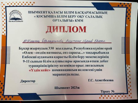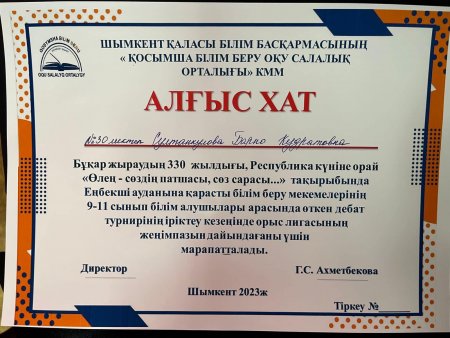 Шымкент қалалық білім басқармасына қарасты Ораз Жандосов атындағы №30 жалпы білім беретін мектебі Қазыбек би атындағы №36 мектебінде Бұқар жыраудың туылғанына 330 жыл толуына орай «Өлең сөздің патшасы, сөз—сарасы...» атты Еңбекші аудандық дебат іріктеу турнирі 9-11 сыныптар арасында өтті. Мектебіміздің атынан орыс лигасынан «Сознательное поколение» фракциясынан 11-сынып оқушылары Мусаев Ерасыл, Дормидонтова Анастасия және ағылшын лигасынан «Dream team» фракцияларынан 11-сынып оқушылары Шалькова Любава, Курманбаев Самандар қатысып, орыс лигасы «Үздік кейс», ағылшын лигасы «Үздік спикер» номинацияларына ие болды.