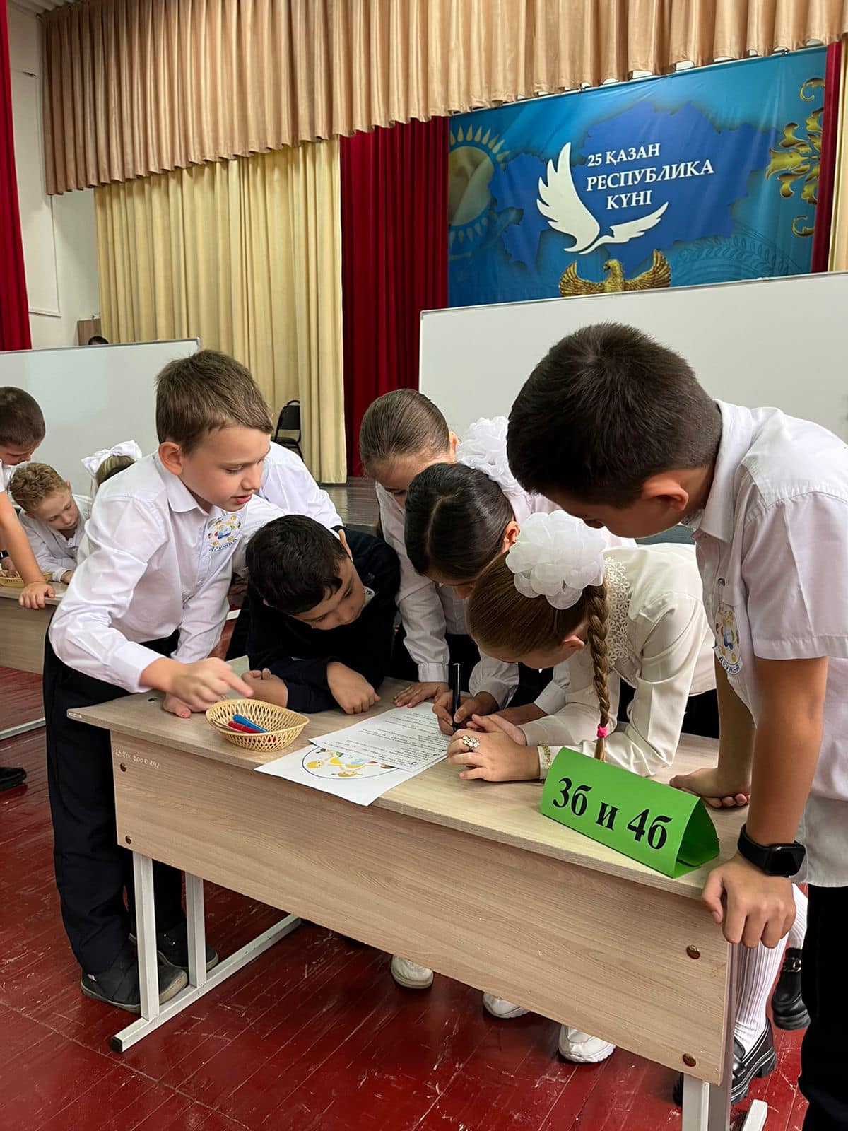 Сначала ребята презентовали свои команды: читали стихотворения и исполняли песни о своей Родине, затем показали свои знания по истории и географии Казахстана, составляли синквейн и кластер о нашей стране.