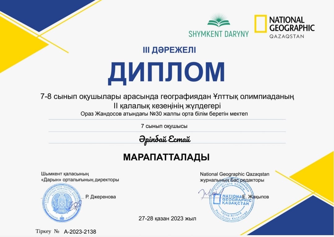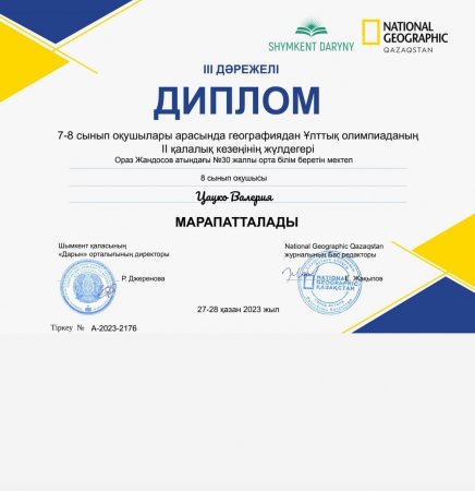 Олимпиада география пәні бойынша екі турда өткізілді. Олимпиаданың облыстық (қалалық) кезеңіне Шымкент қаласы бойынша 215 оқушы қатысты. Ораз Жандосов атындағы №30 жалпы орта білім беретін мектебінің география пәні мұғалімдері Мамаева Шәрбану және Шишкалова Елена апайлардың жетекшілігімен 7 және 8-сынып оқушылары Естай Әріпбай пен Цацко Валерия қазылар алқасының шешіміне сәйкес ІІІ дәрежелі дипломдармен марапатталды. Жетекші ұстаздары мен ата-аналарына алғыс білдіреміз! Марапат құтты болсын, жетістіктер молая берсін!