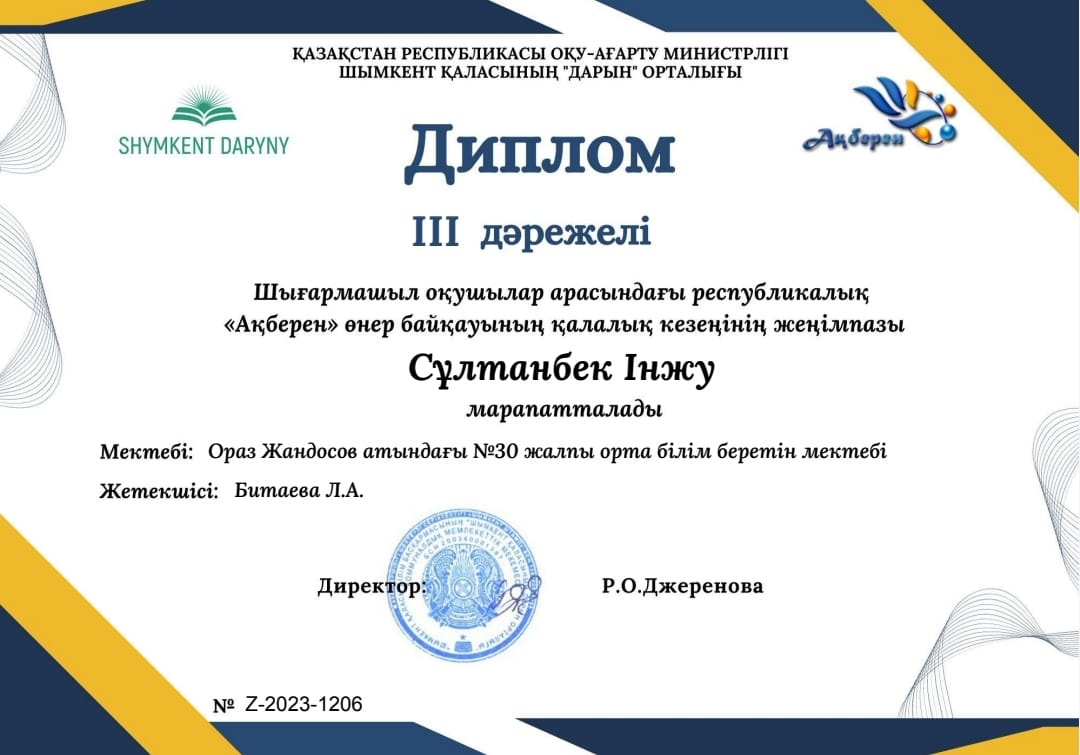 Ағымдағы жылдың 3 қараша күні «Ақберен» атты республикалық өнер байқауының қалалық кезеңі өтті. Бұл байқауға Ораз Жандосов атындағы №30 жалпы орта білім беретін мектебінің дарынды оқушысы 9-сынып оқушысы СҰЛТАНБЕК ІНЖУ қатысып, жүлделі ІІІ орынға ие болды. Жеңімпазымыздың жеңісіне өз үлесін қосқан жетекшісі БИТАЕВА ЛАЗИРА АУЕСХАНОВНАҒА ұжым атынан ерекше алғыс білдіреміз! Біз Сіздермен мақтанамыз!