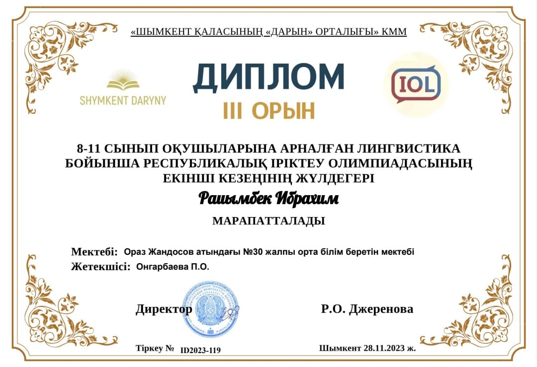 8-11 сынып оқушылары арасындағы Республикалық лингвистикалық олимпиадасының қалалық кезеңінде Шымкент қаласы білім басқармасына қарасты Ораз Жандосов атындағы №30 жалпы орта білім беретін мектебінің 9-сынып оқушысы Ибрахим Райымбекті (жетекшісі Оңғарбаева П.О.) жүлделі ІІІ орнымен құттықтаймыз! Ибрахимді жеткен жетістігімен құттықтаймыз!