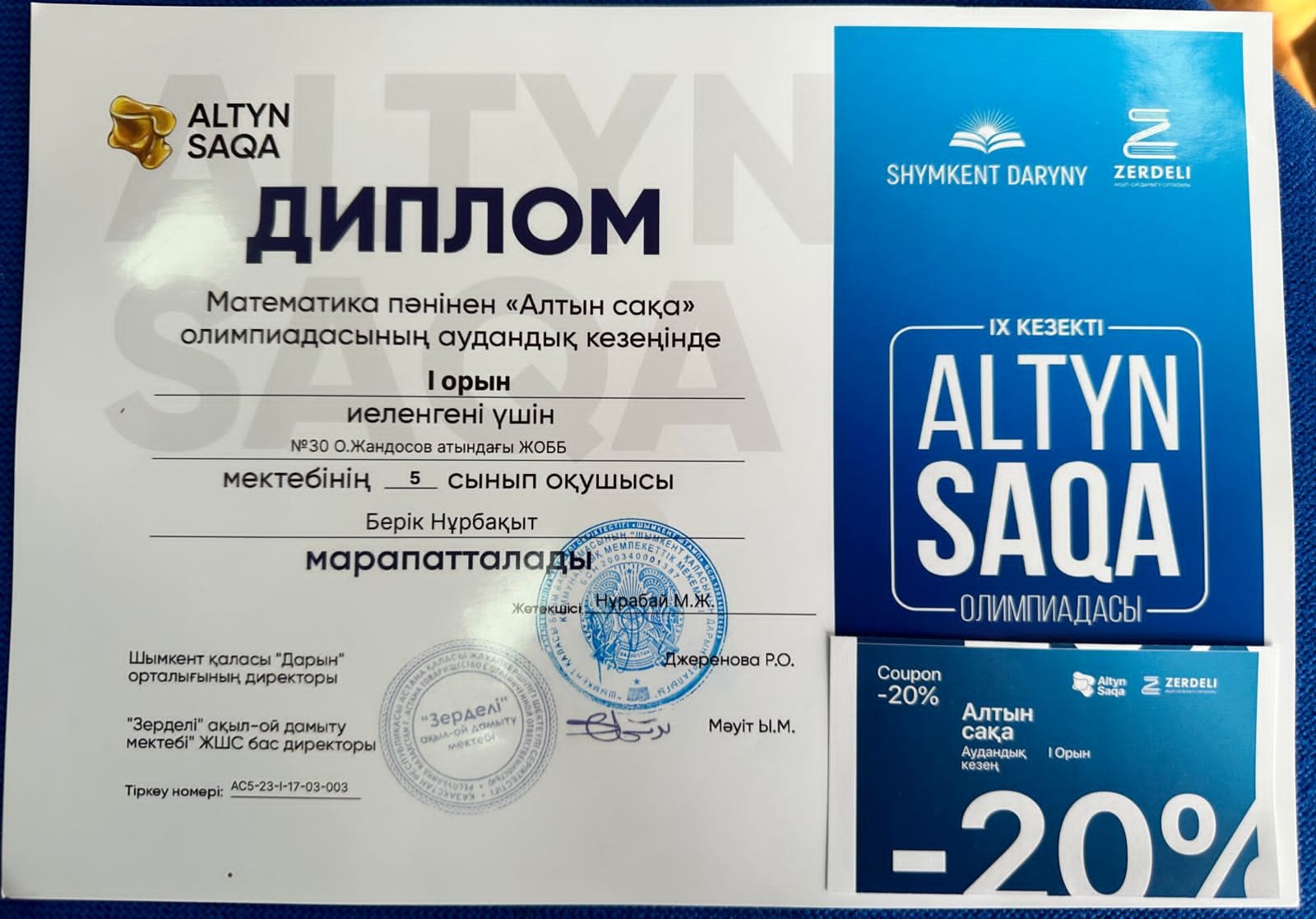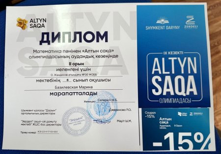 Шымкент қаласы Білім басқармасына қарасты Ораз Жандосов атындағы №30 жалпы орта білім беретін мектеп Шымкент қаласының "Дарын" орталығының КММ, "Зерделі" ақыл - ой дамыту мектебінің 2023 жылғы 7 қыркүйектегі 60/2 хатына сәйкес математика пәнінен "Алтын сақа" республикалық олимпиадасының аудандық кезеңінен жүлделі І орын алған 5-сынып оқушысы Берік Нұрбақыт пен ІІ орын алған 6-сынып оқушысы Базиловская Марина марапаттау рәсіміне қатысып, дипломдармен марапатталды.