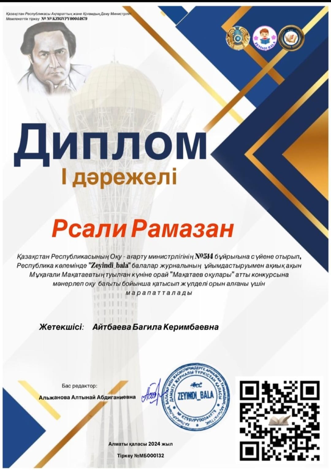 Қазақстан Республикасының Оқу-ағарту министрлігінің №514 бұйырығына сүйене отырып «ZEYINDI BALA» балалар журналының ұйымдастыруымен жас ұрпақты кітап оқуға баулу мақсатында Республикалық ақиық ақын Мұқағали Мақатаевтың туылған күніне орай «Мұқағали оқулары» атты байқауына Ораз Жандосов атындағы №30 жалпы орта білім беретін мектебінің 4 «А» сынып оқушылары Дильмурадқызы Айару, Рсали Рамазан, Құдайберген Аяулым, Жәнібек Ернұр, Пернебекқызы Айару және Анархан Абылайхан қатысып, жүлделі орындар алды.