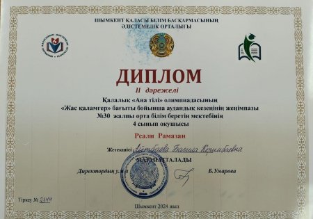 Шымкент қалалық білім басқармасына қарасты Ораз Жандосов атындағы №30 жалпы орта білім беретін мектебінің 4 «А» сынып оқушысы РСАЛИ РАМАЗАН 3-4 сынып оқушылары арасындағы «Ана тілі» олимпиадасының «Жас қаламгер» бағыты бойынша аудандық кезеңінде бақ сынап, нәтижесінде ІІ-орынды иемденді. Бүгін мектеп директоры Сихамбекова Жансұлу Абдразаққызы жас жеңімпаз Рамазанды марапатымен құттықтап, шығармашылық табыс тілеп, қаламың шыңдалып, биік шыңдардан көріне бер, аңсаған арманыңа жетуіңе тілектеспін деп жүрекжарды жылы лебізін білдірді.