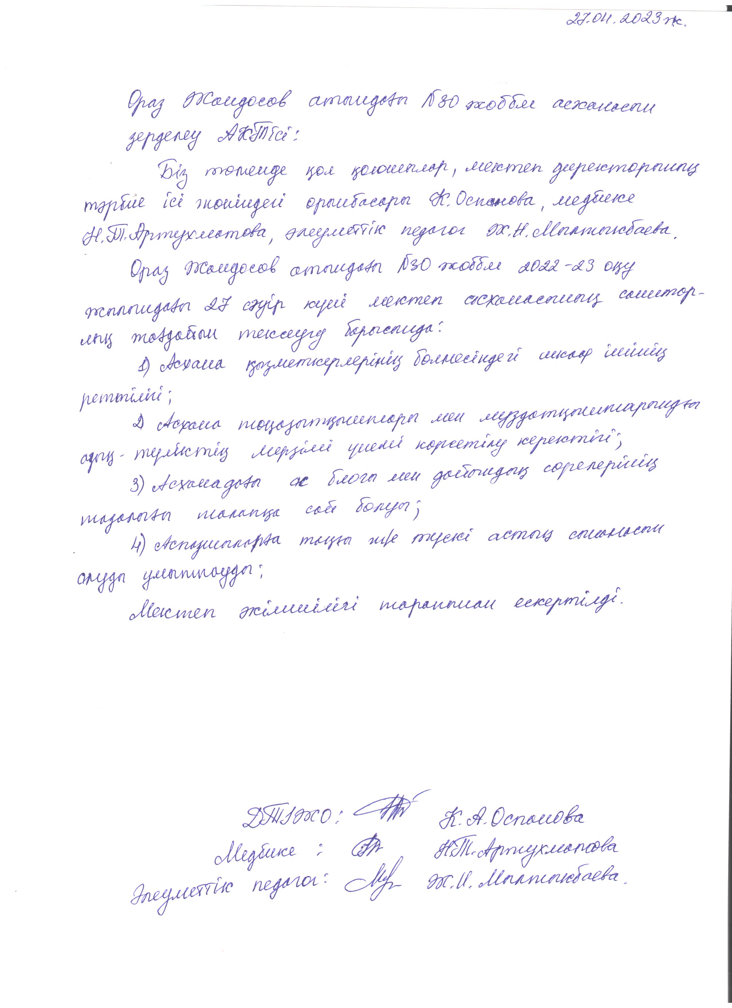 Бракераждық комиссияның мектеп асханасын тексеру АКТлері - сәуір айы
