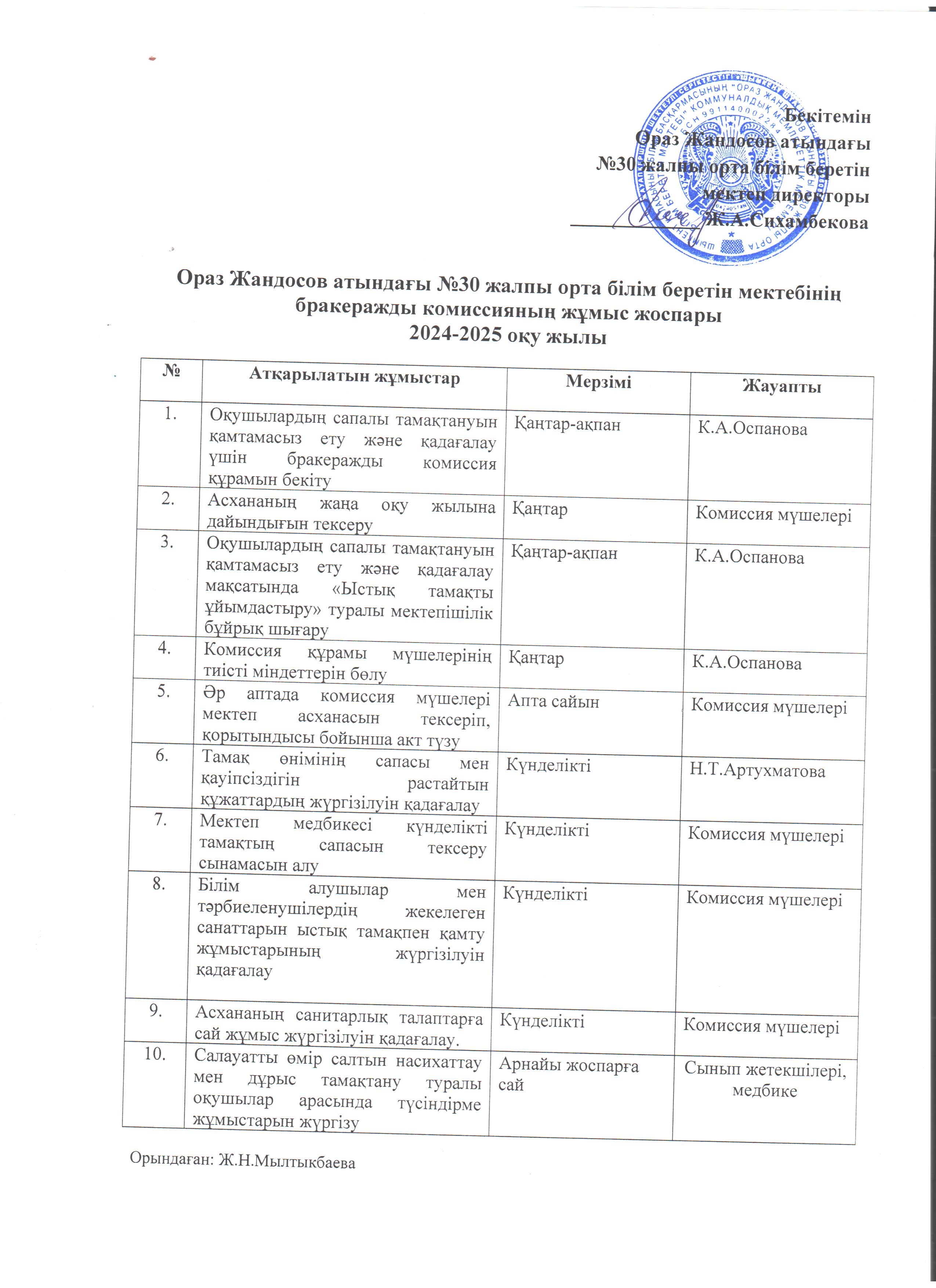2024-2025 жаңа оқу жылына бракераждық комиссияның жұмыс жоспары