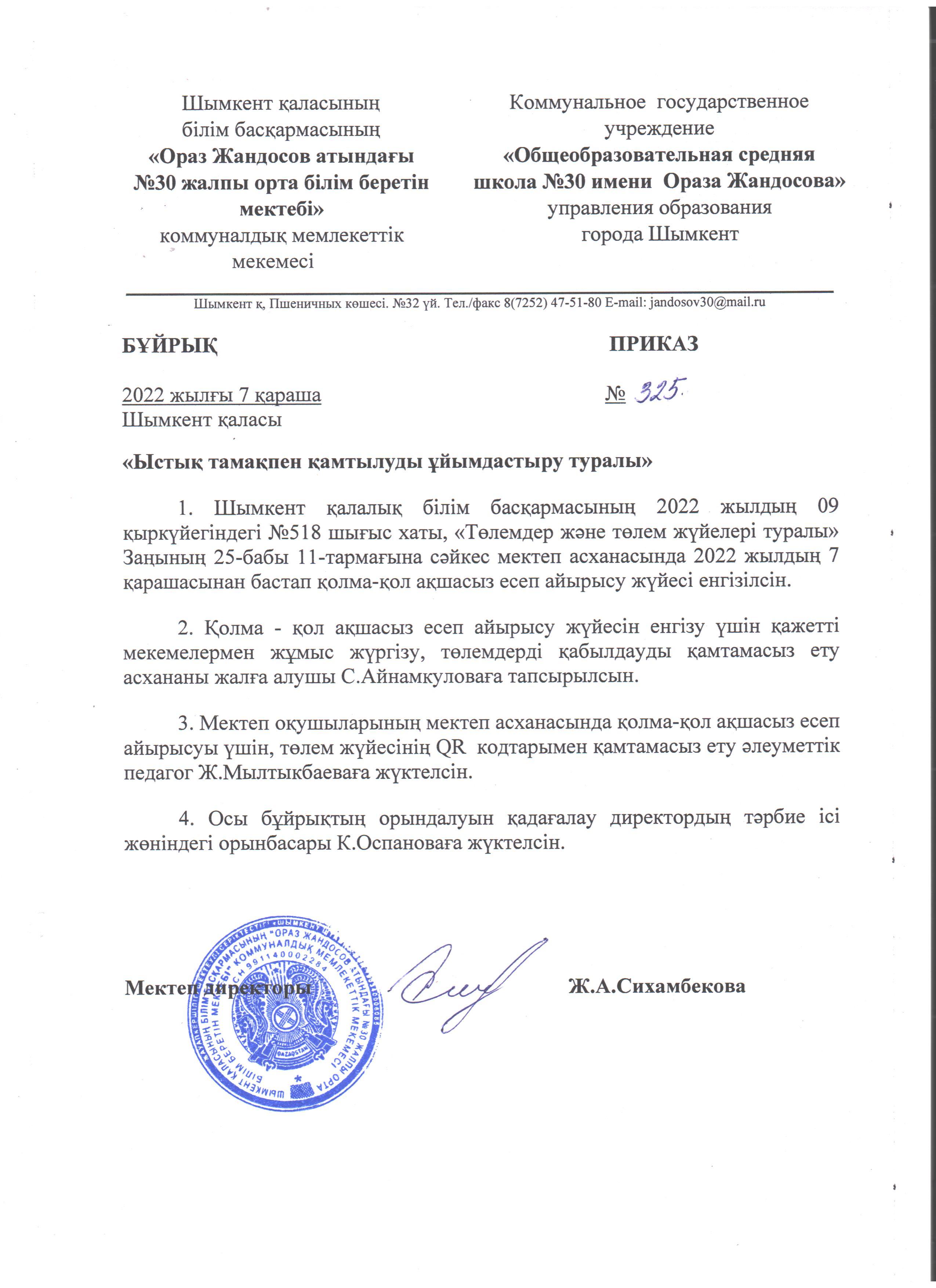 Қолма-қол ақшасыз есеп айырысу жүйесін енгізу туралы бұйрық