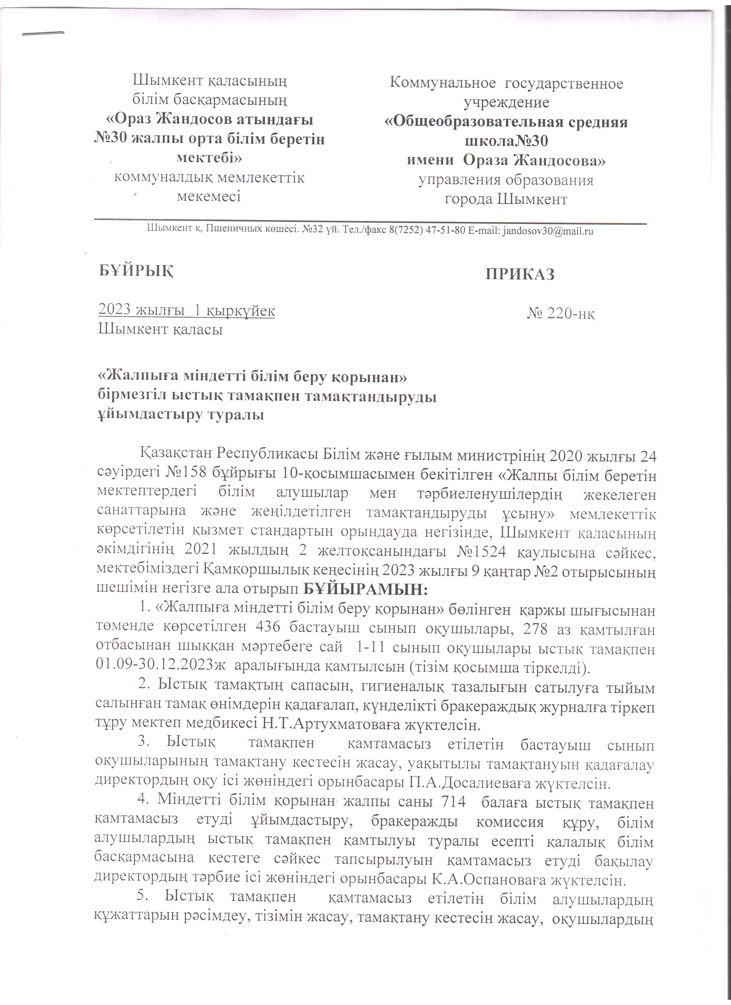 » "Ыстық тамақпен қамту туралы" бұйрық