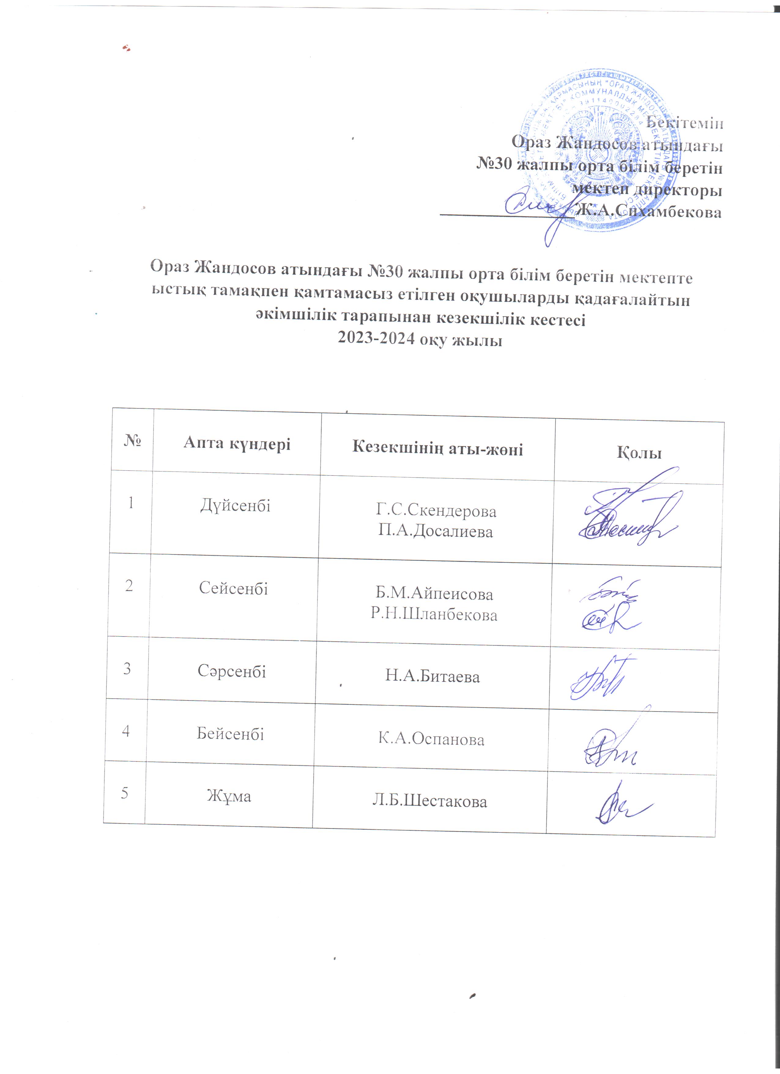 Әкімшілік тарапынан кезекшілік кестесі