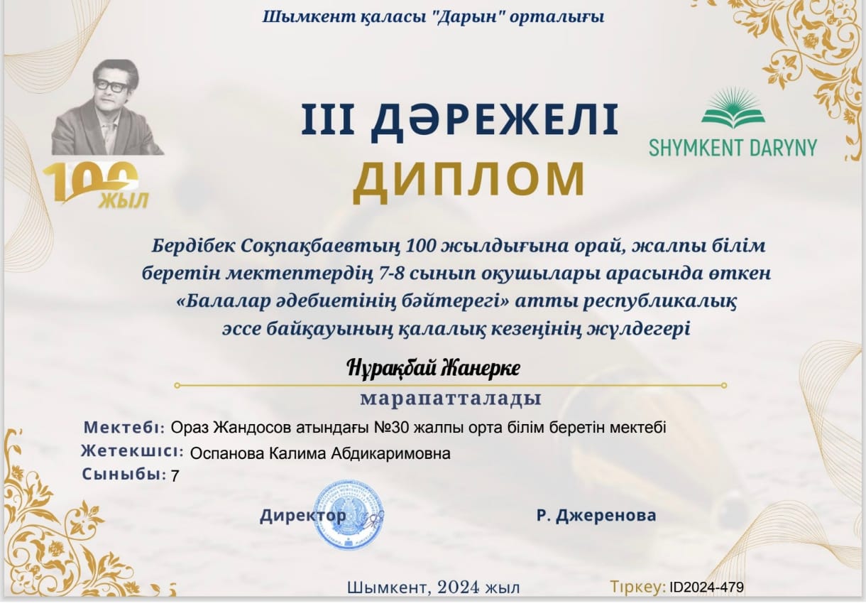 Бұл байқауда Ораз Жандосов атындағы №30 жалпы орта білім беретін мектебінің 7 «А» сынып оқушысы Нұрақбай Жанерке үшінші орынды иеленді.